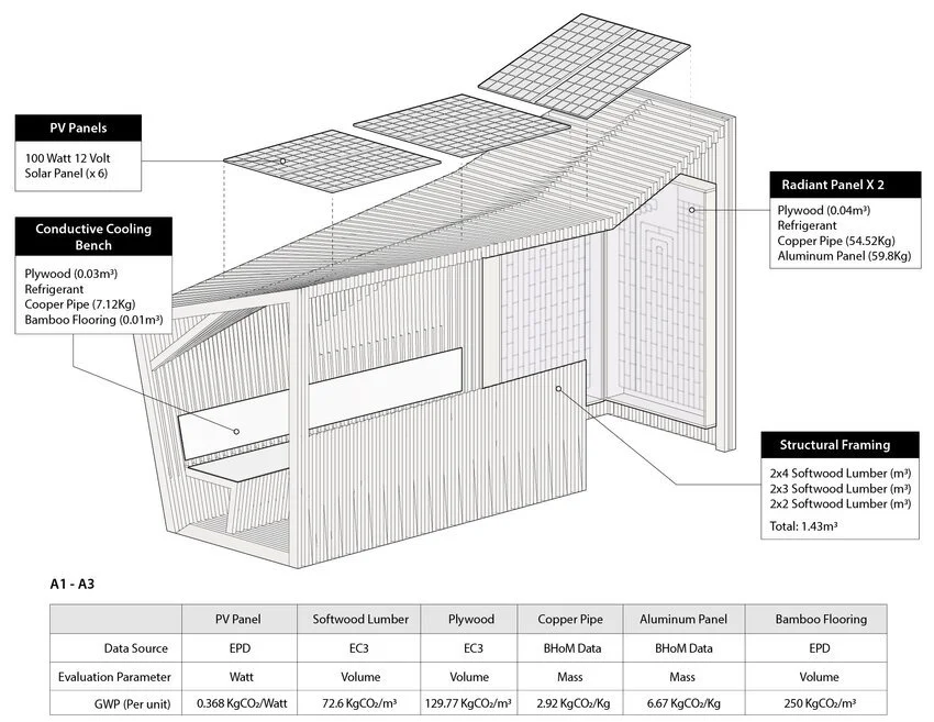 Urban environments require sustainable cooling solutions due to the heat island effect and increasing heatwaves. However, conventional air conditioning systems often have negative environmental impacts, primarily from embodied and operational carbon and fugitive refrigerant emissions. Therefore, we envision a net-zero carbon outdoor cooling system using a cradle-to-cradle (C2C) approach and life cycle assessment (LCA). A solar-powered cooling shelter was designed with conductive benches and radiant panels that transfer heat from the human body without enclosing users in an air-conditioned space. To achieve carbon neutrality, embodied carbon reduction strategies were integrated into the design and fabrication stages, including the selection of materials based on global warming potential (GWP). Environmental simulations and in-situ power monitoring sensors optimize and estimate avoided emissions from photovoltaic energy use. Finally, end-of-life strategies-such as recycling construction materials and system components-are proposed to assess the shelter’s full C2C life cycle.